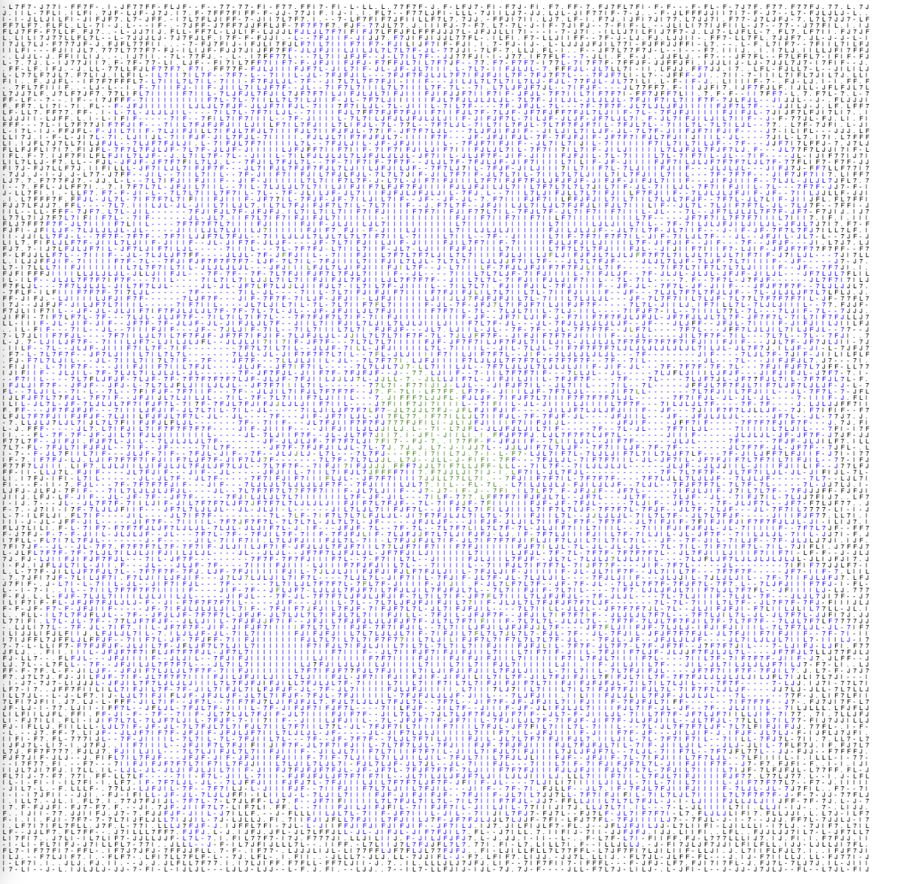 In the above diagram, you can still figure out which pipes form the main loop: they’re the ones connected to S, pipes those pipes connect to, pipes those pipes connect to, and so on. Every pipe in the main loop connects to its two neighbors (including S, which will have exactly two pipes connecting to it, and which is assumed to connect back to those two pipes).