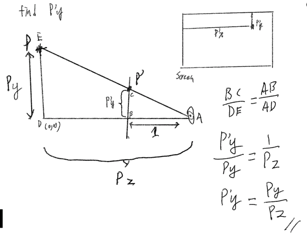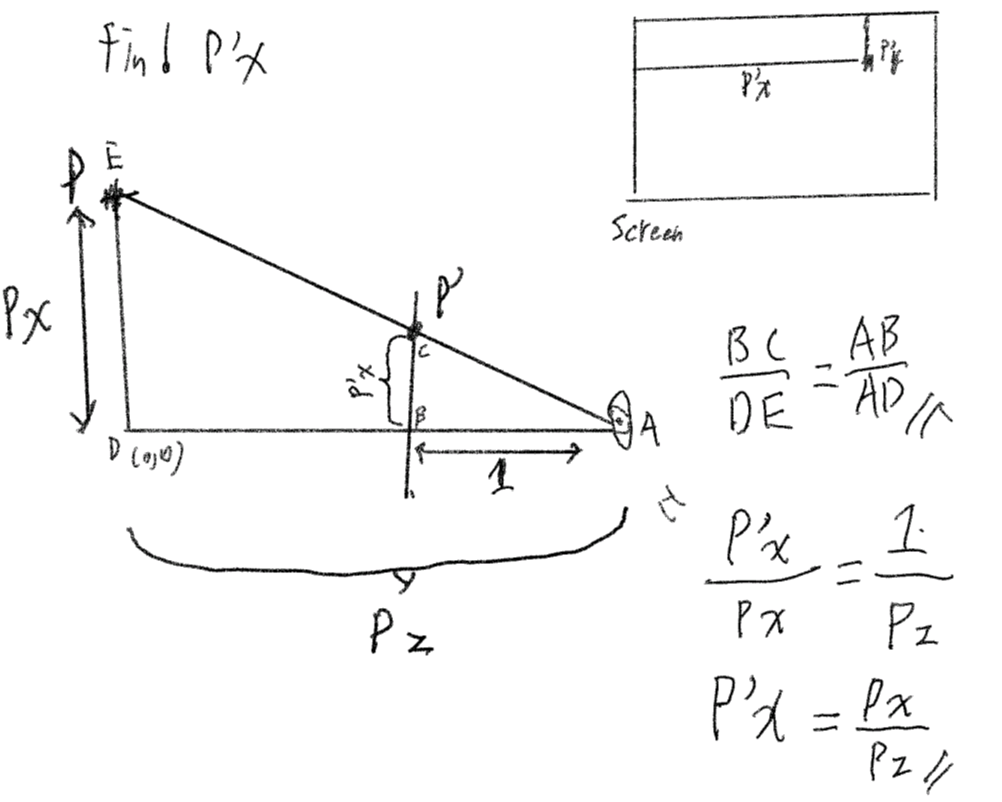 Finally we get a formular call prespective divide: $$ P’x = \frac{Px}{Pz} $$ $$ P’y = \frac{Py}{Pz} $$ Simple formular, but tell you the magic - The x and y is relate with z value is big or small.